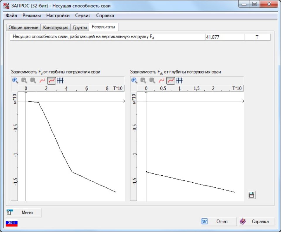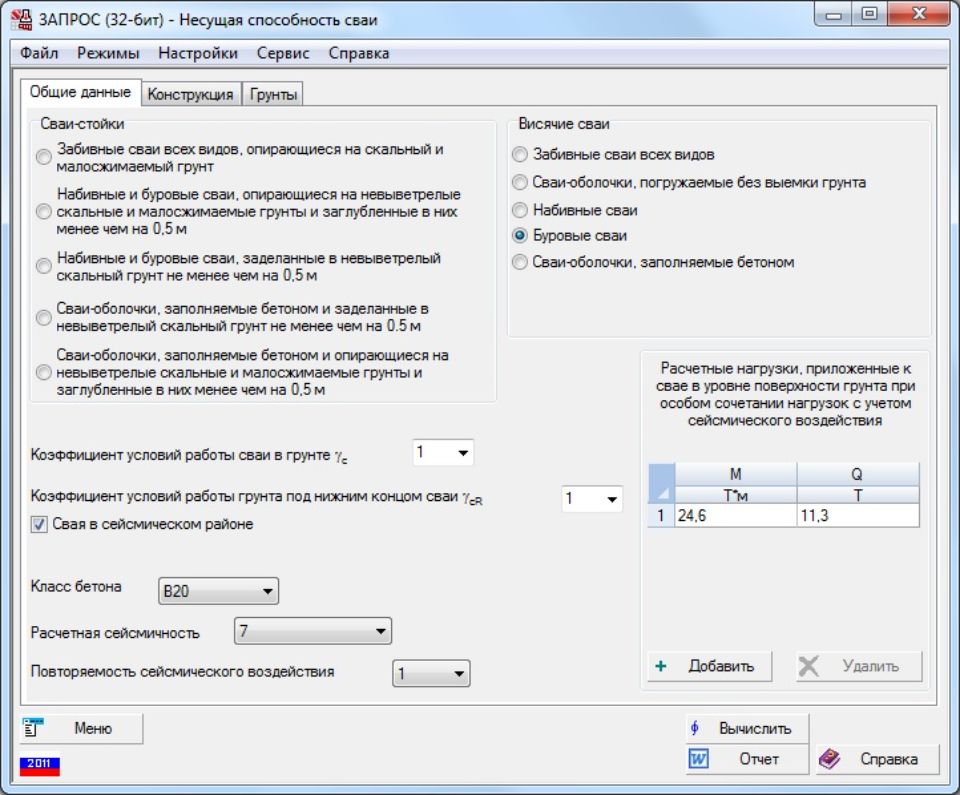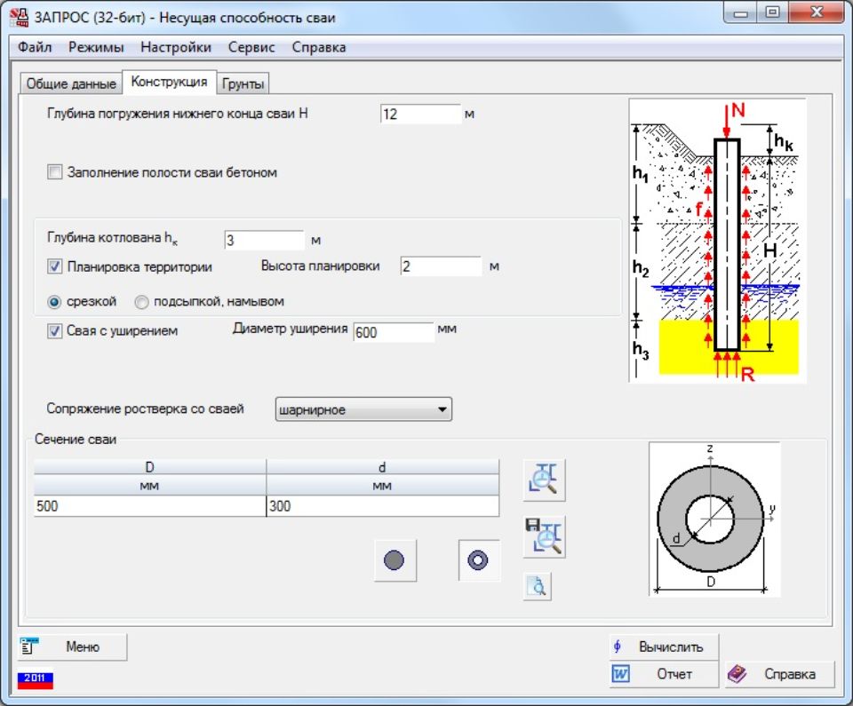 • Раздел полевых испытаний свай. Позволяет рассчитать несущую способность свайных деталей в зависимости от исхода динамических испытаний. Можно определить несущую способность забивных висячих свай разными методами — через испытания грунтов сваей-эталоном, через испытания грунтов зондом-сваей, через статическое зондирование.